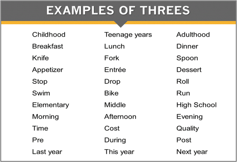 This strategy is persuasive, as your listener is more likely to trust your reasoning with a three-part structure. It’s rhythmical—meaning it creates momentum, moving your listener from point A to B to C. Lastly, this strategy is memorable because it is far easier to remember three things over other numbers like four, five or ten. If you’re skeptical, look at these common examples: