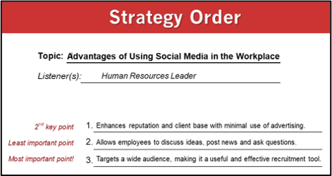 And rather than someone asking you for a project update, sometimes we need to sell or position an idea or product in the best way possible. Obviously, you will want to focus on how your listener will benefit. It is also helpful, though, to place your three reasons/benefits in a specific order. The goal is to start strong, but end with your strongest point of all: